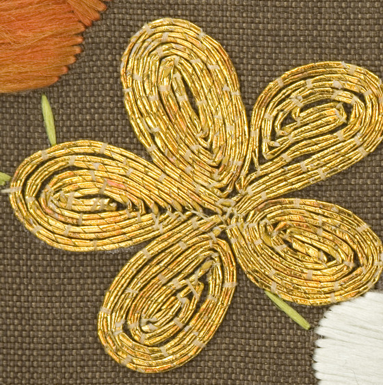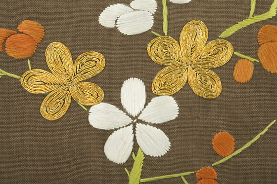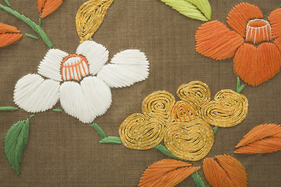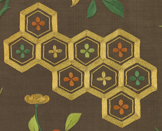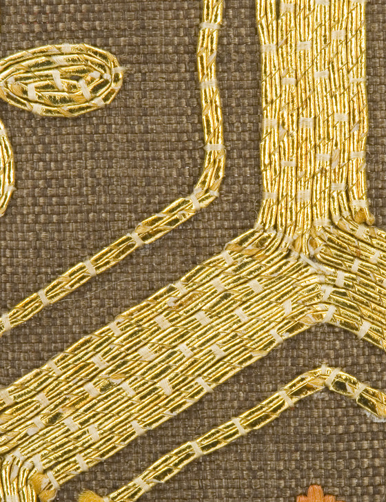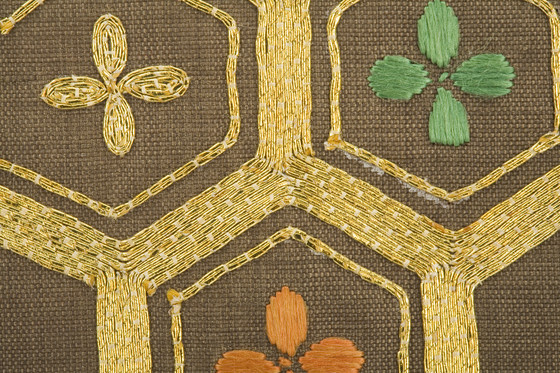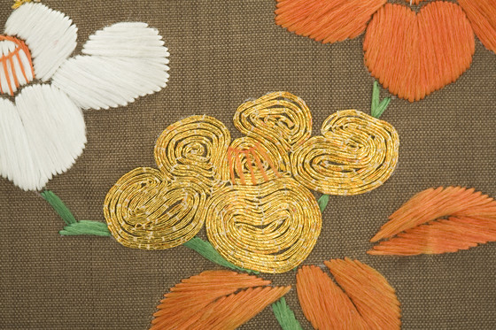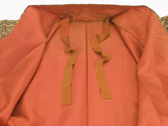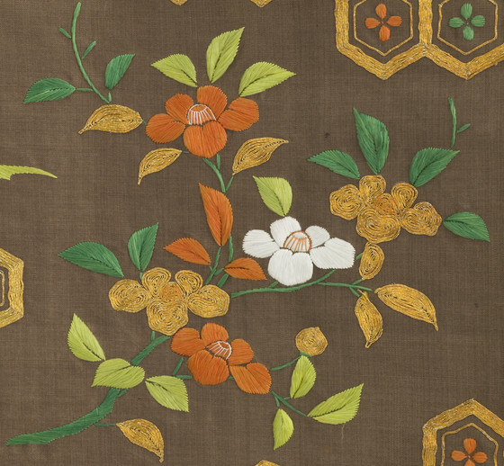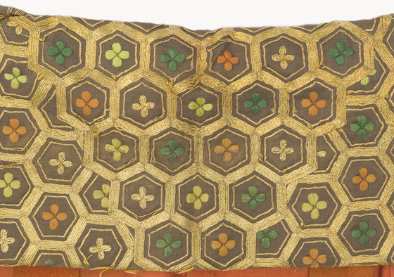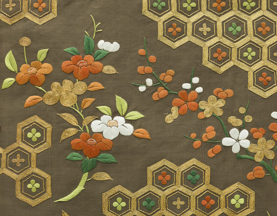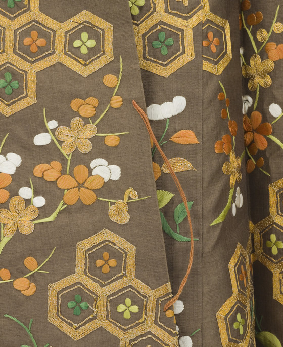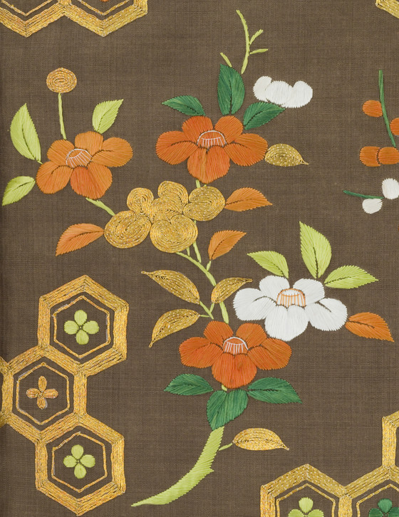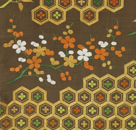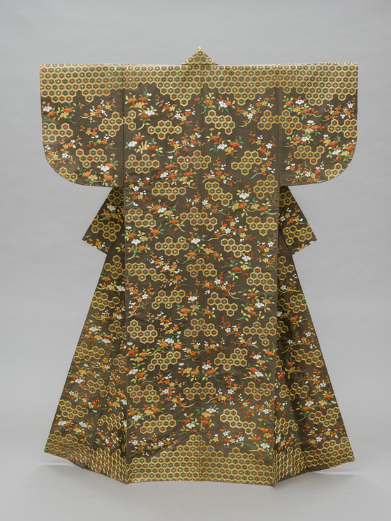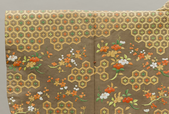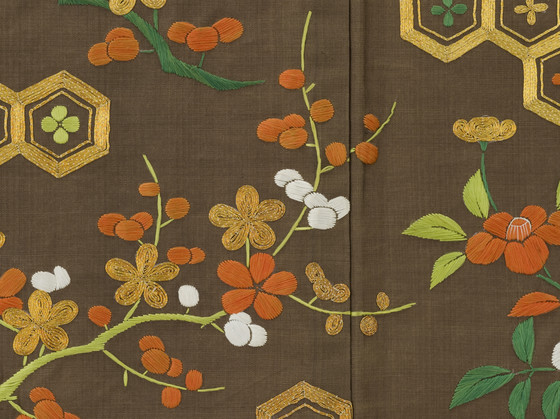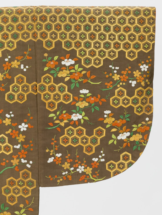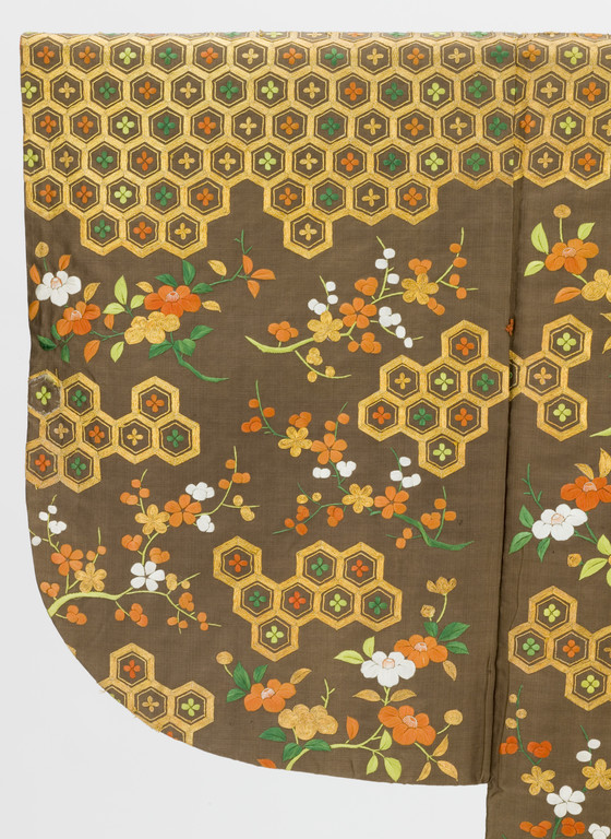 In the late Edo period, the format and composition of the koshimaki became standardized as summer formal attire for elite samurai women. Its ground fabric was of dark brown, black, or gray nerinuki, a silk textile made with unglossed warps and glossed wefts. Small-scale auspicious symbols decorated the surface; flowering plum blossoms, signifying purity, and hexagonal "tortoise shells" and camellias, for longevity, are meticulously embroidered on this robe with multiple threads of gold.
