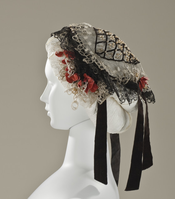 Linen net with linen lace, silk lace, silk velvet, and glass beads