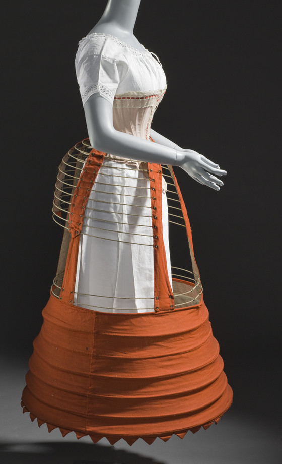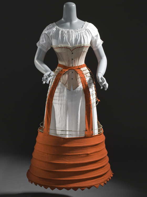 Cotton plain weave with silk embroidery, linen lace with silk satin ribbon trim, and metal