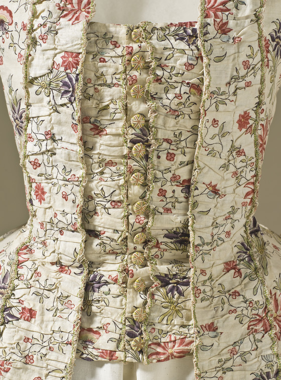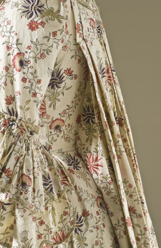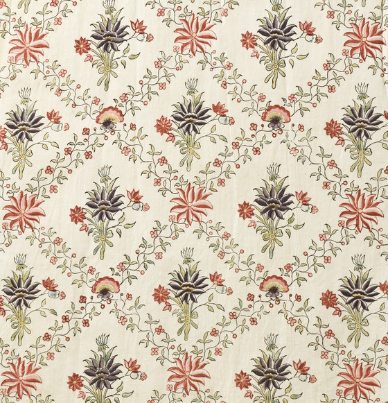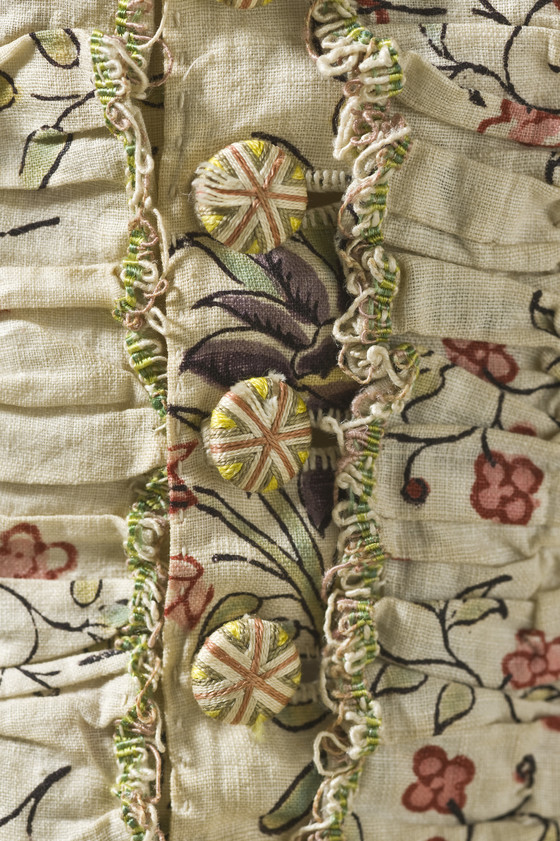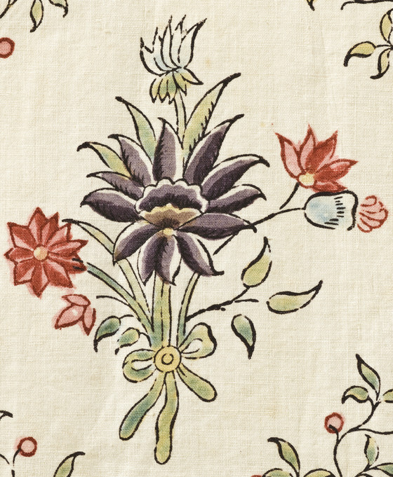 Cotton and linen plain weave, block-printed and dye-painted, with silk passementerie