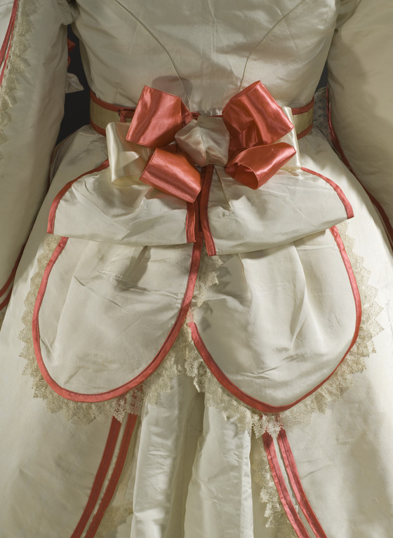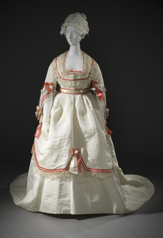 Bodice, Overskirt, and Belt: Silk plain weave (taffeta) with silk satin, linen lace, silk net, and silk satin ribbon; Skirt: Silk plain weave (taffeta)