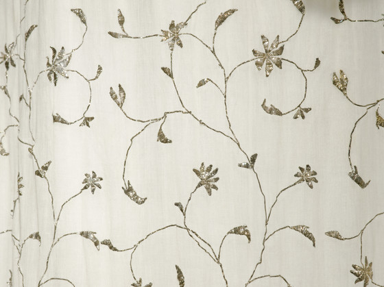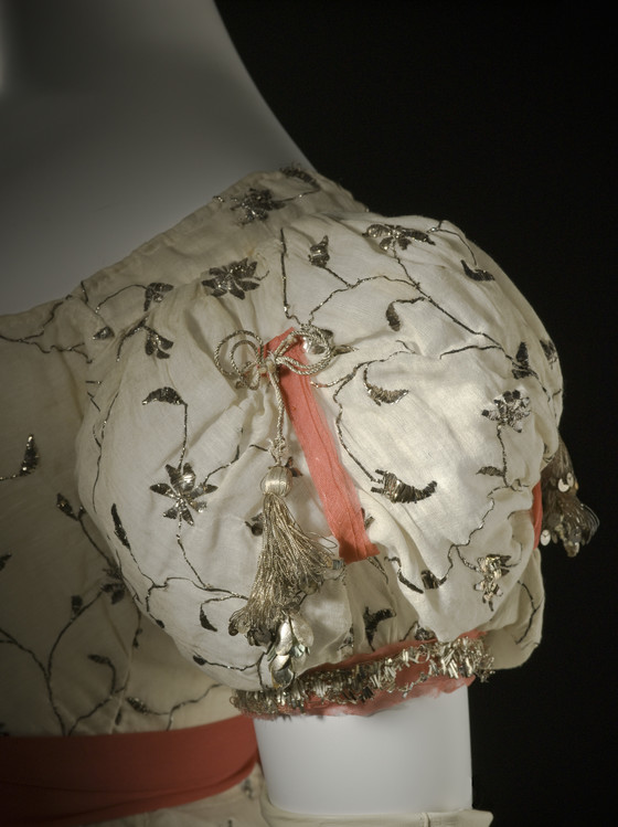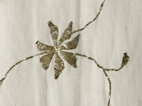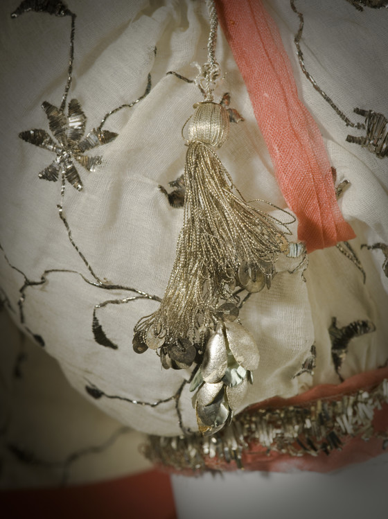 Cotton plain weave with metal strip embroidery and silk gauze with metallic thread and metal sequin passementerie and metallic thread tassels