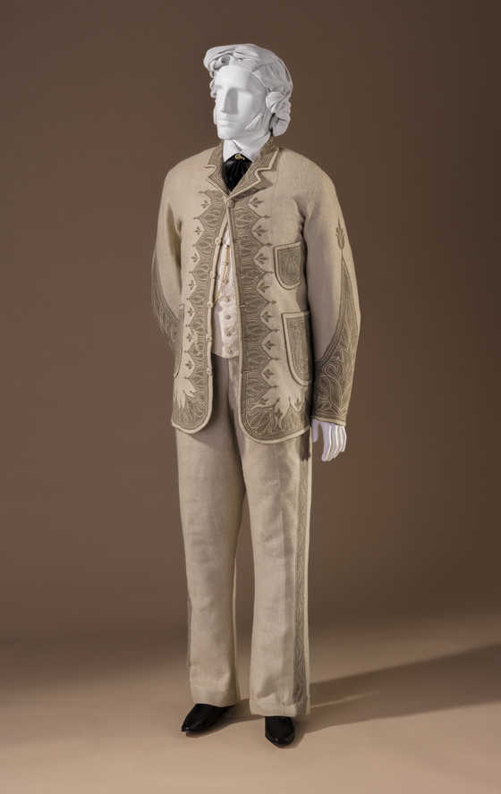 A) Coat center back length: 31 1/4 in. (79.375 cm); B) Trousers inseam length: 32 1/2 in. (82.55 cm)