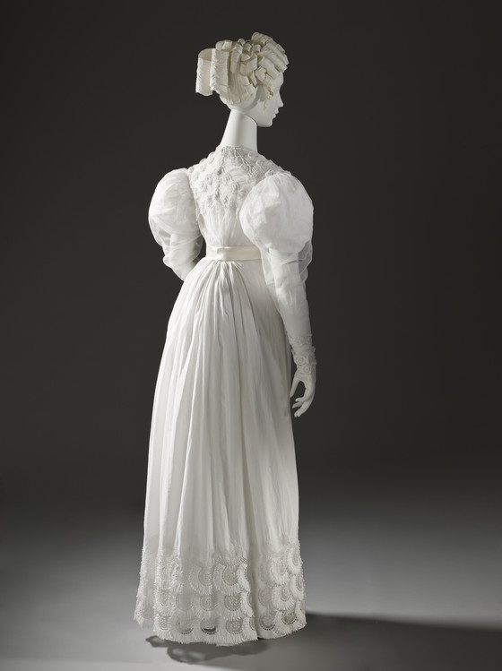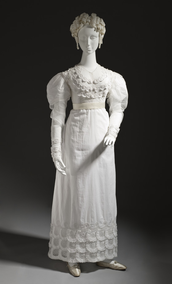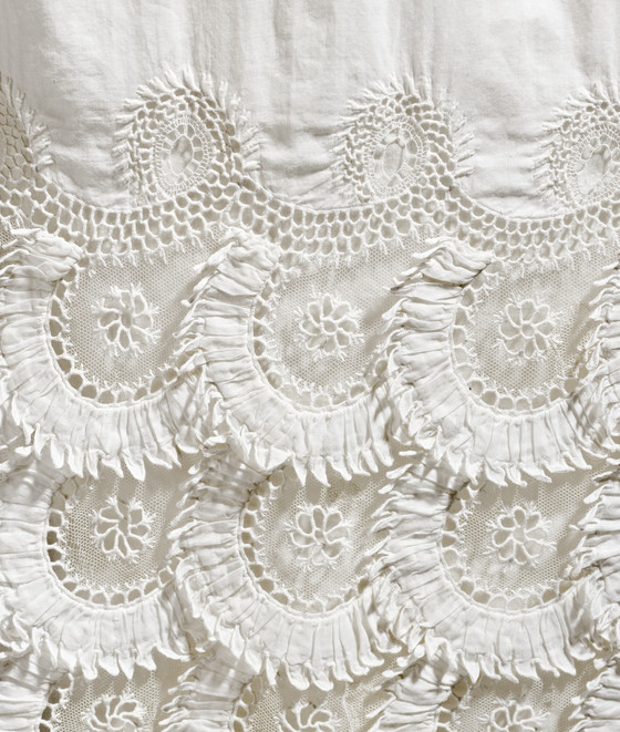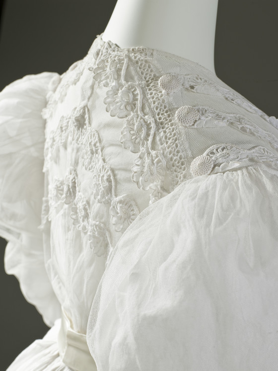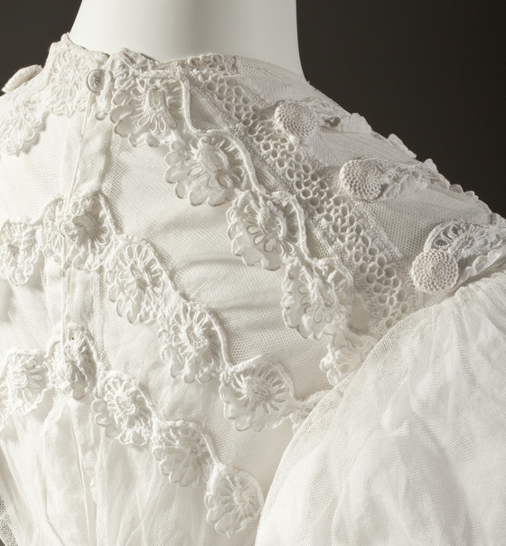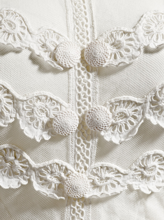Linen plain weave and silk net with cotton cutwork embroidery (broderie anglaise) and cotton crochet covered buttons