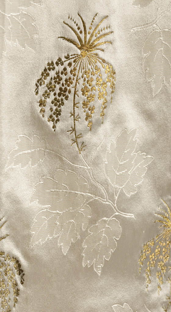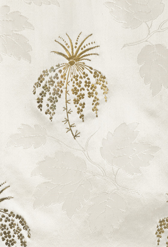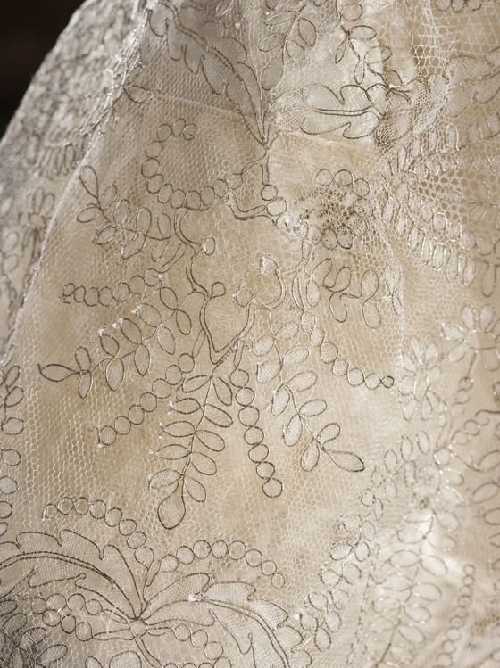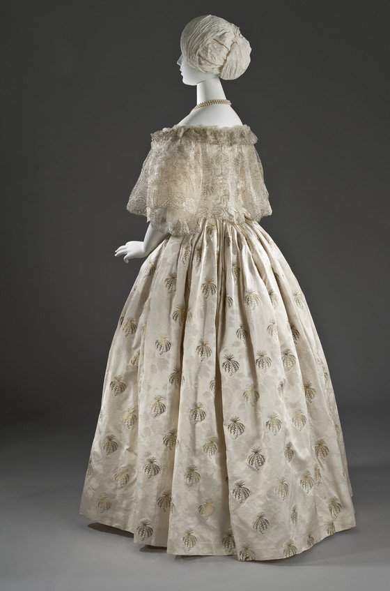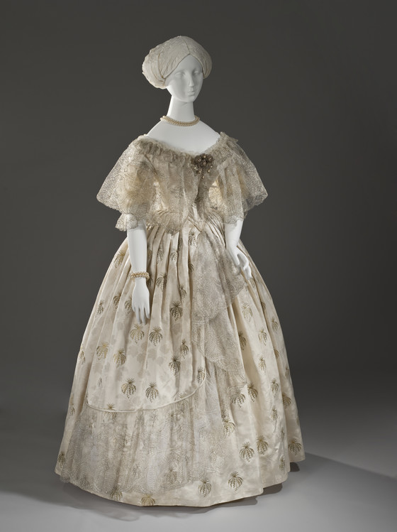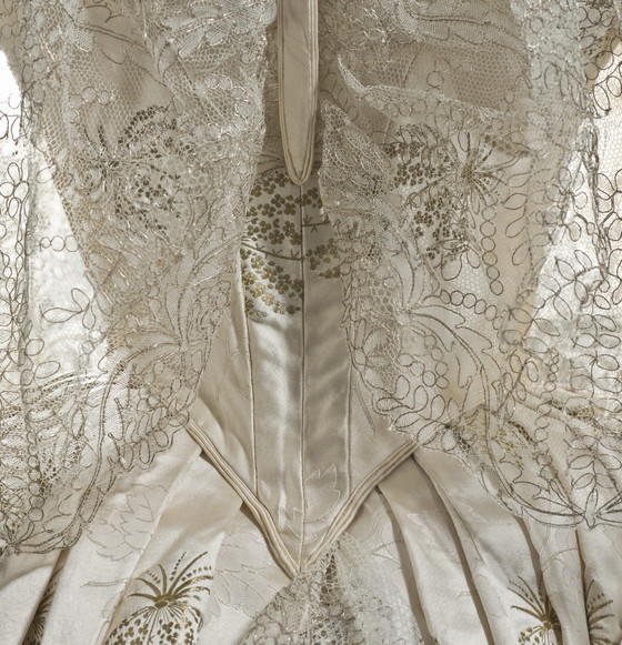 Bodice: Silk satin with silk and metallic-thread supplementary weft patterning with silk and metallic-thread lace, silk satin, silk net, cotton net, and silk satin ribbon with metallic thread supplementary warp patterning and edging: Skirt: Silk satin with silk and metallic-thread supplementary weft patterning with silk and metallic-thread lace, and silk satin.