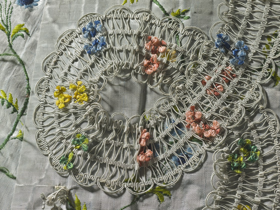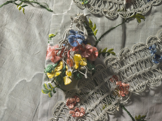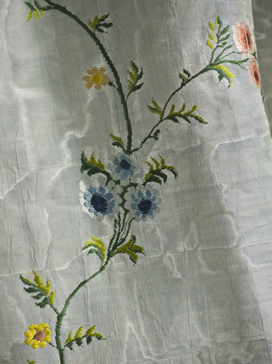Silk plain weave (faille) with supplementary weft-float patterning, moiré finish, and silk passementerie with silk fly fringe