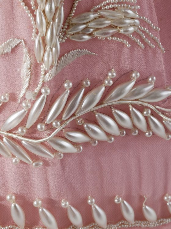 Silk plain weave (organza) and silk satin with imitation-pearl glass beads