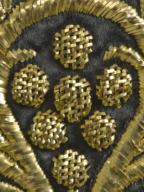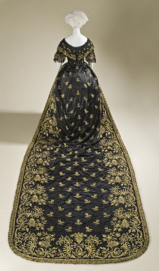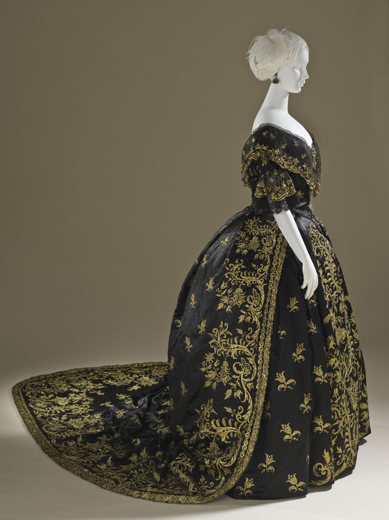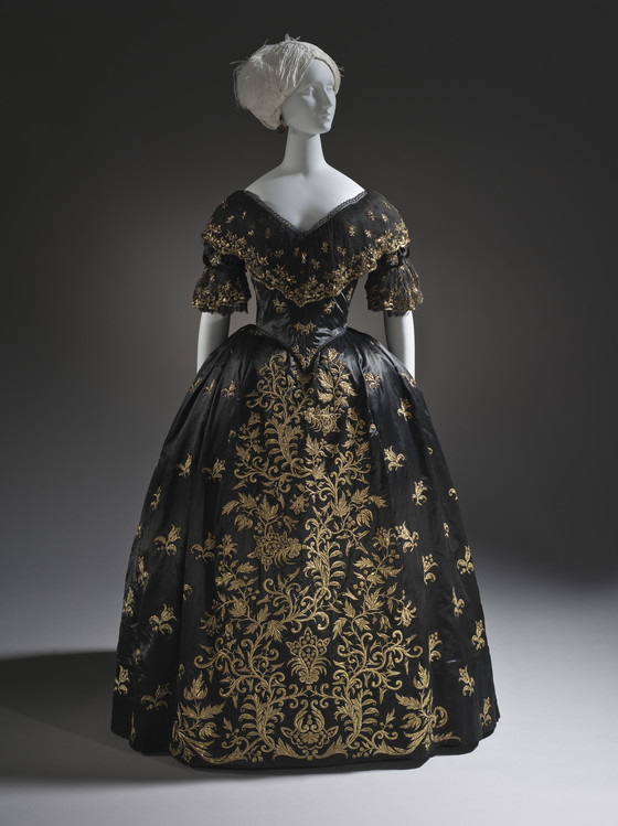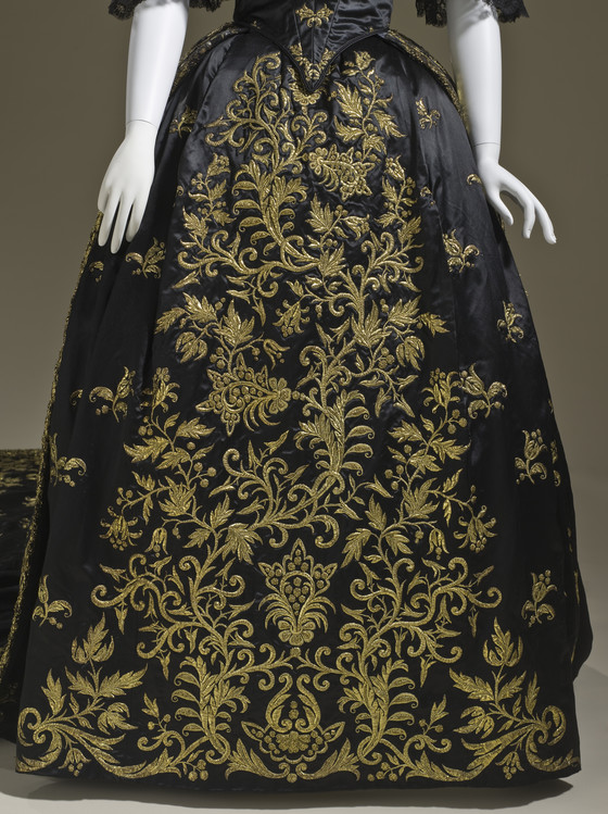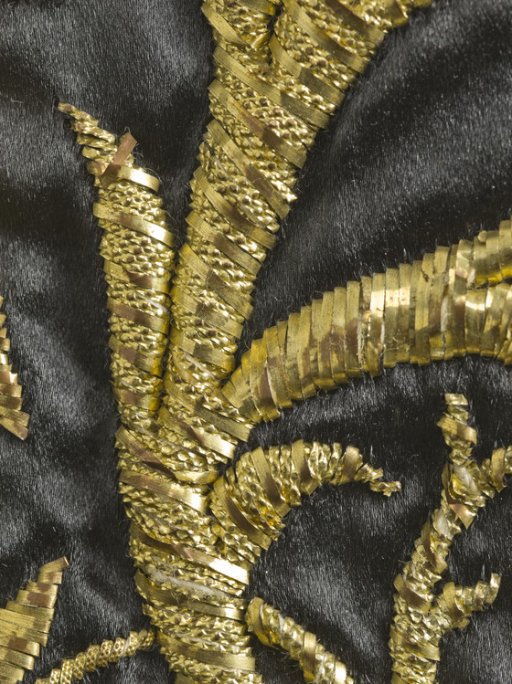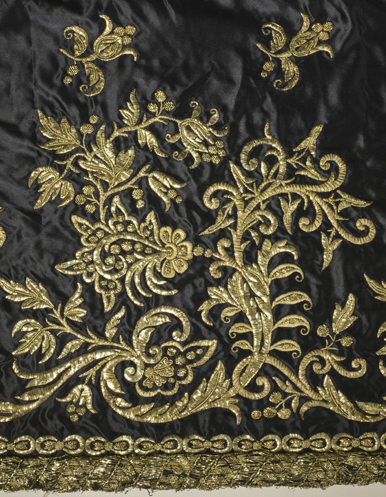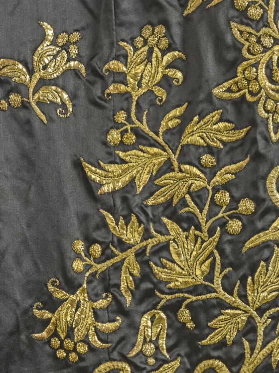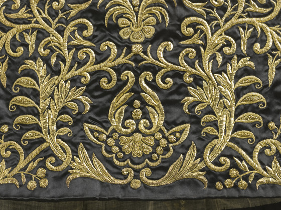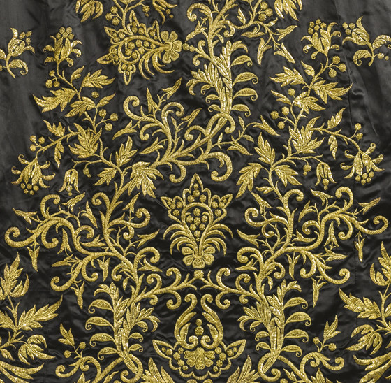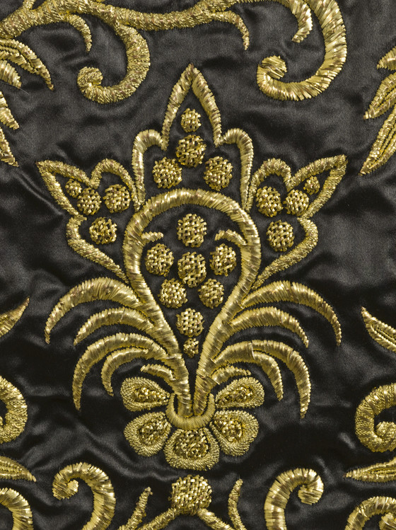 a) Silk satin with metallic-thread embroidery and silk net (tulle) trim; b-c) Silk satin with metallic-thread embroidery