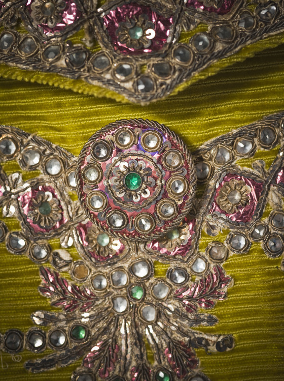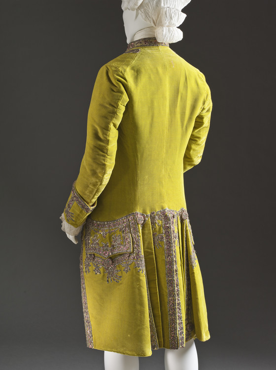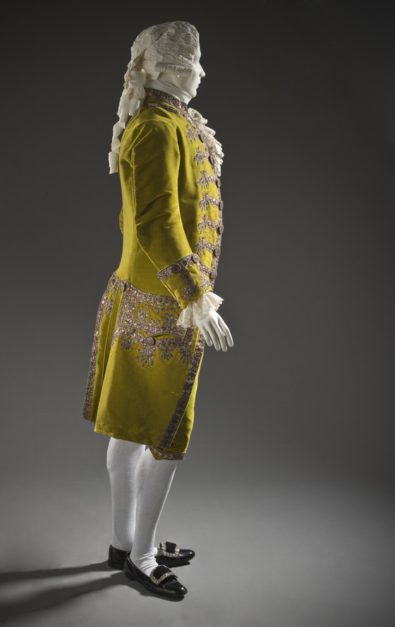 Coat and breeches: silk cut and uncut velvet on twill foundation with paste stones, foil, sequins, and metallic-thread embroidered appliqués; waistcoat: silk satin with foil, sequins, and metallic-thread embroidery