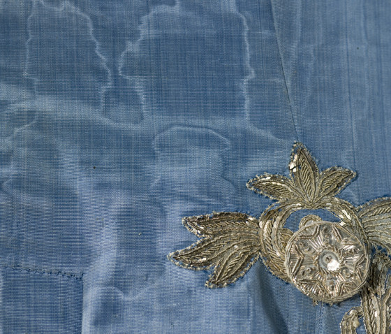 Silk plain weave (faille), moiré finish, with sequins and metallic-thread embroidery