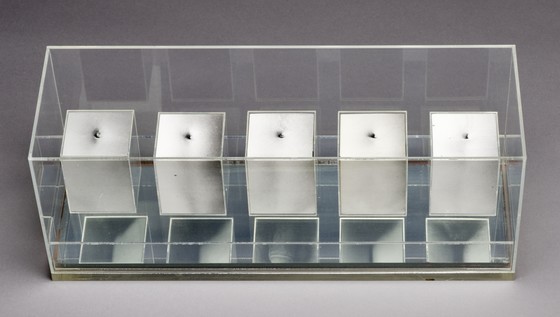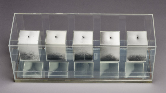 a-e) Photo box: 4 x 3 1/4 x 3 in. (10.16 x 8.26 x 7.62 cm) each; f) Plexi vitrine: 8 1/4 x 22 1/4 x 7 1/4 in. (20.96 x 56.52 x 18.42 cm); g) Plexi base with mirror: 2 3/4 x 21 7/8 x 6 7/8 in. (6.99 x 55.56 x 17.46 cm)