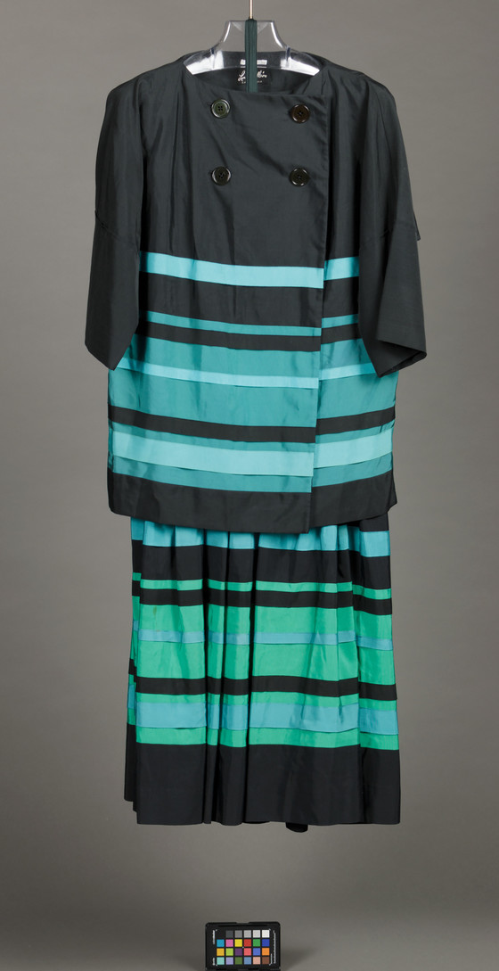 Skirt: rayon faille with grosgrain ribbon trim; Jacket: rayon faille with grosgrain ribbon trim and plastic buttons.