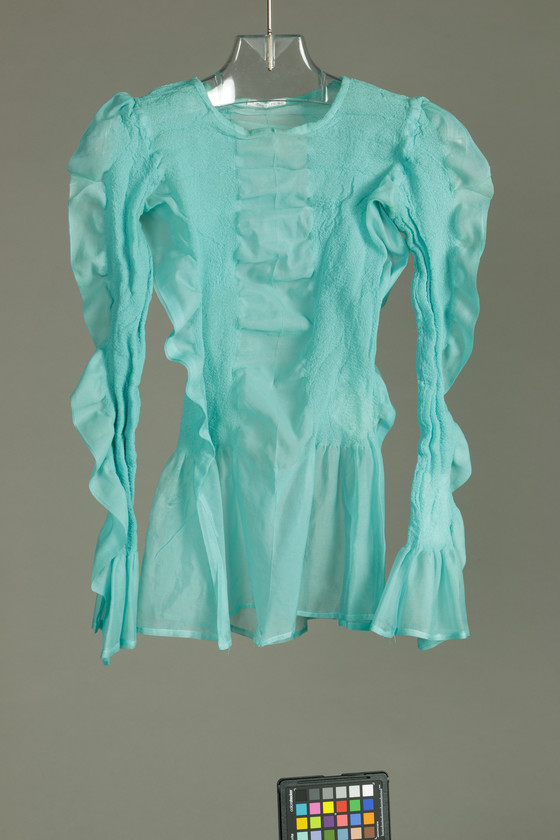 Polyester/polyurethane plain weave (organdy), paste-resist screenprinted, washed in calcium chloride (salt-shrink), and heat- and pressure-set pleats