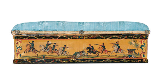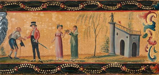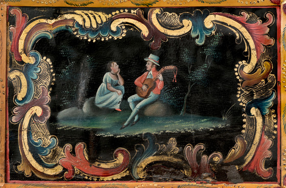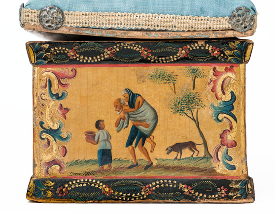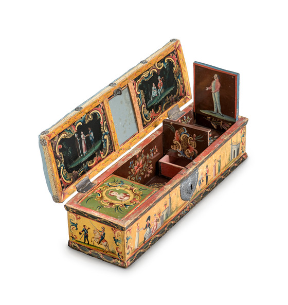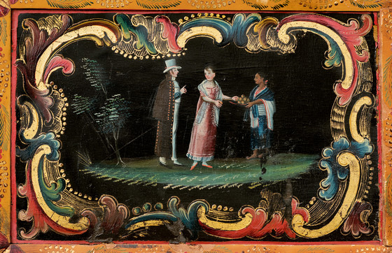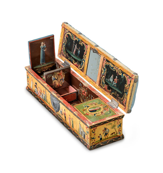 This special sewing box tells us many stories: stories of artistic exchange through the materials and motifs used, stories of life in Mexico through the vignettes that unfold in painted scenes, and stories of hidden secrets that we only discovered while installing the work in LACMA’s exhibition Archive of the World: Art and Imagination in Spanish America, 1500–1800.