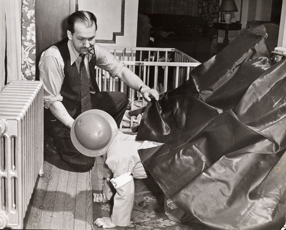 Eugene Mott using whistle to teach his children instinctive recognition of air raid signals, Queens Village, NY, 1941