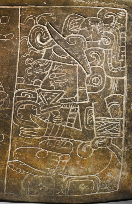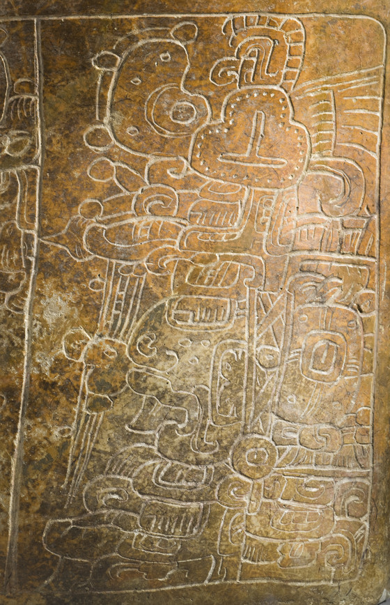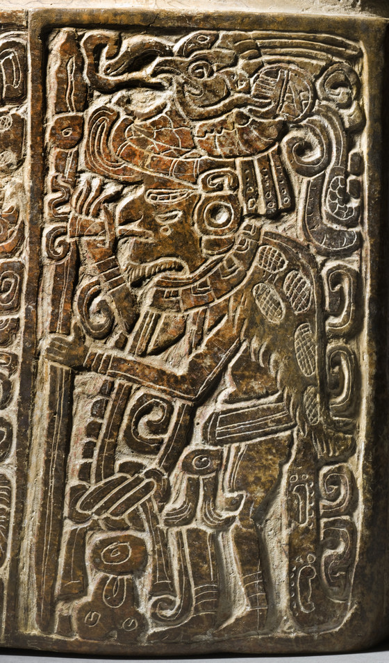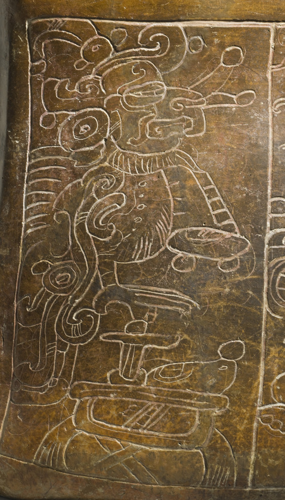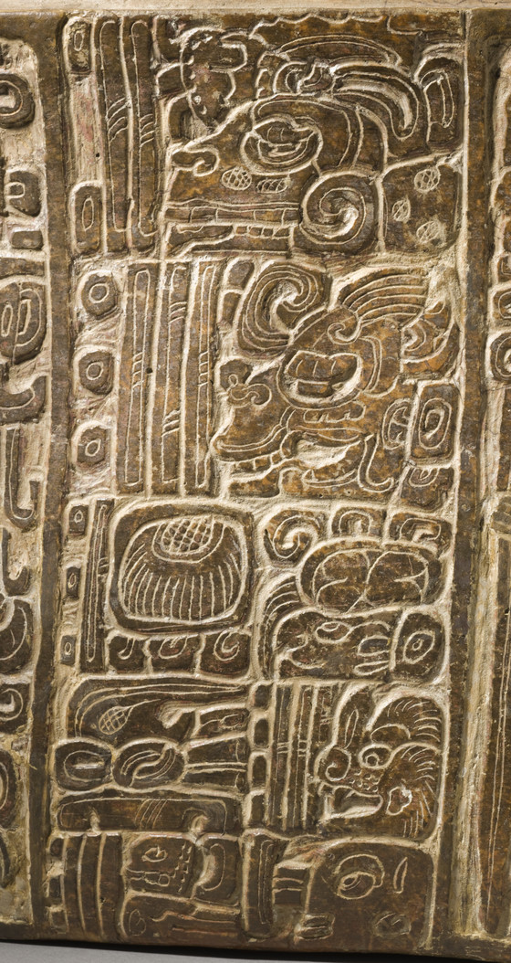 Two figures are lightly incised into this panel. On the left, the Principal Bird Deity, patron of the earliest Maya kings, is depicted wearing its mirror necklace and perched in a bowl that holds jade and shell jewels. The adjacent seated figure is relatively unknown, although he wears a hat associated with hunters. He carries a name on his hat describing him as nen winik (mirror man), and oval signs on his body denoting mirrors mark him as a supernatural being. The cushion on which he sits spells out the word pop, or mat, a visual pun.