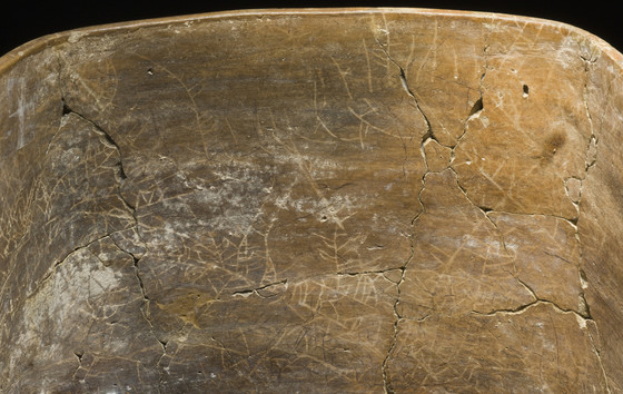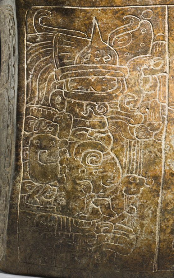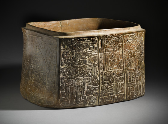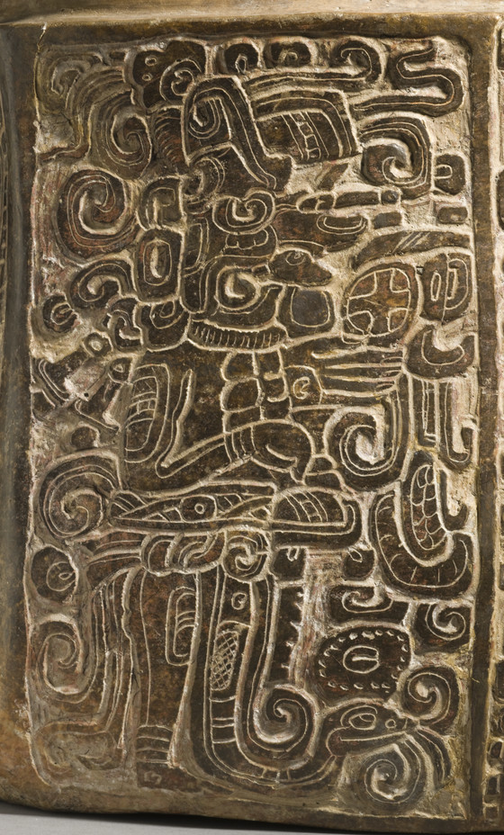 This ornately decorated box, carved on the front panel and incised on its sides, is a tour de force of Maya ceramic art. The front panel records the last part of a date in the Maya calendar, which can be reconstructed as occurring in the mid-fifth century, and the style of the carving is consistent with that date. The unusual scale of this box suggests that it may have held the valued possessions of an unnamed king, such as royal garments or books, protected within the sealed environment from insects and the humidity of the tropical climate.