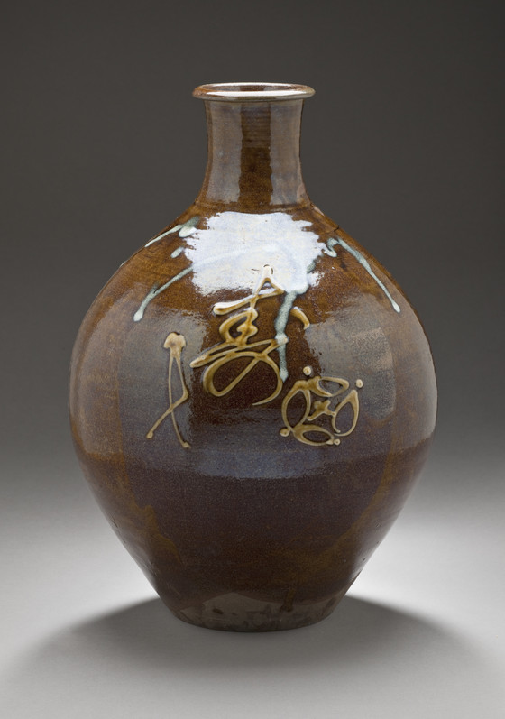 Onta ware; stoneware with iron glaze and yellow slip decoration and rice straw ash glaze drip
