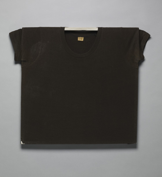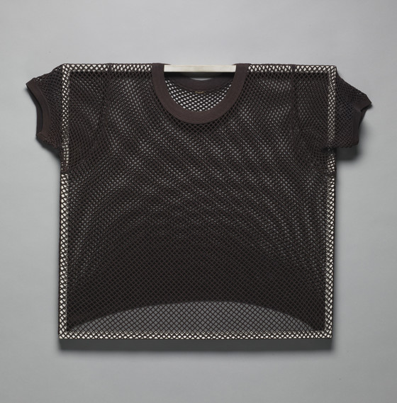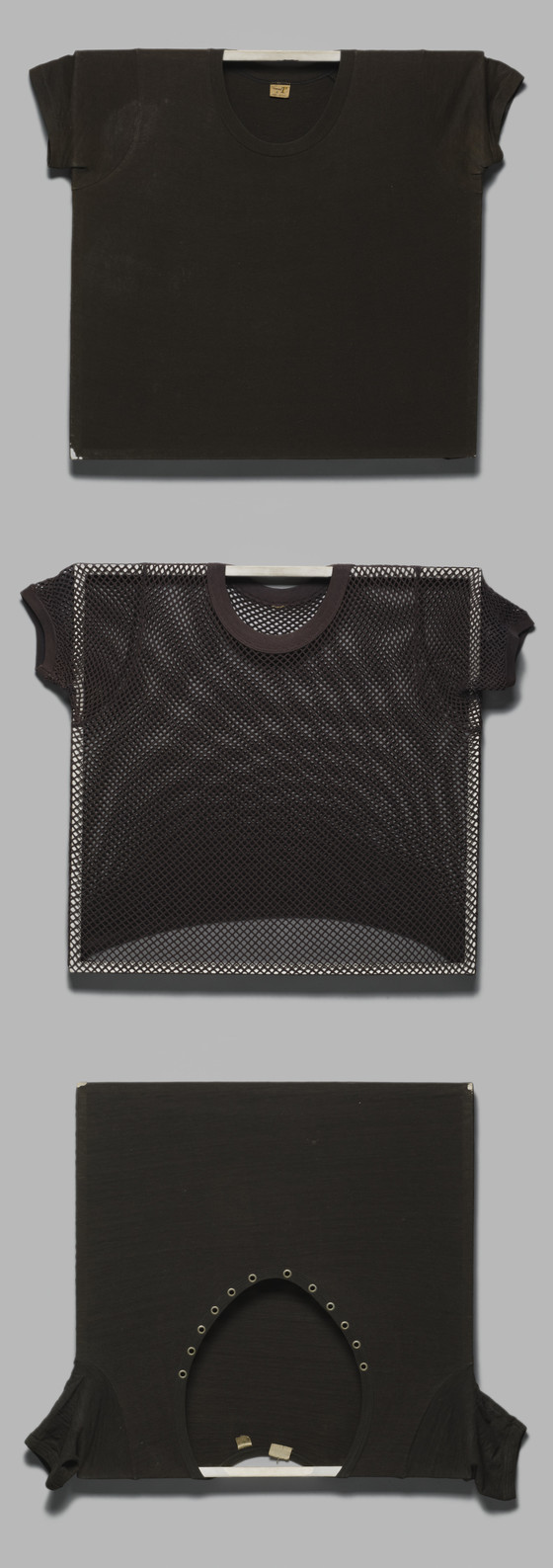 Object (each frame): 21 1/8 x 21 1/8 x 1 3/16 in. (53.6 x 53.6 x 3 cm) Object (mesh t-shirt): 21 1/4 x 25 9/16 x 1 1/4 in. (54 x 65 x 3.2 cm) Object (grommet t-shirt): 21 1/16 x 28 3/8 x 1 1/4 in. (53.5 x 72 x 3.1 cm) Object (black t-shirt): 21 3/16
