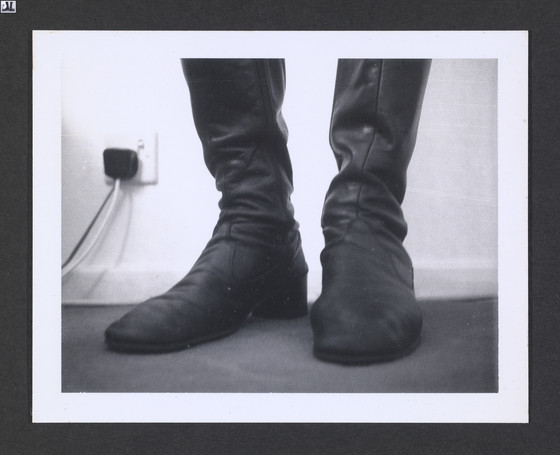 Descriptive: ( triptych, boots/crotch/milk)