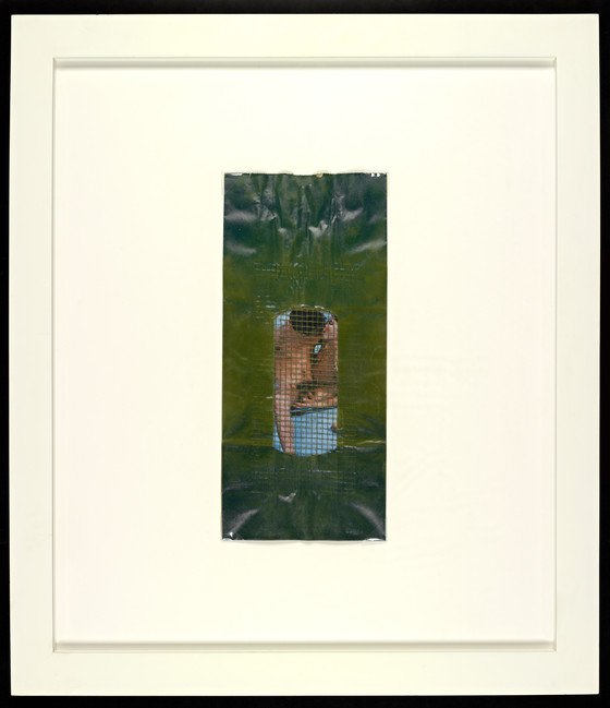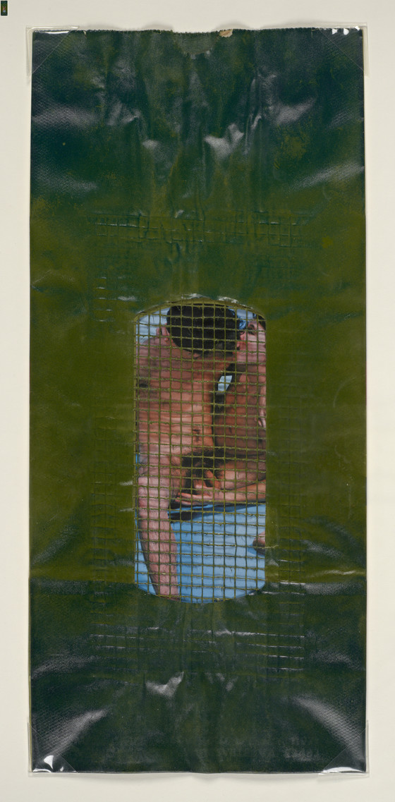 Collage: magazine clipping, paint, and spray paint on paper bag with mesh window