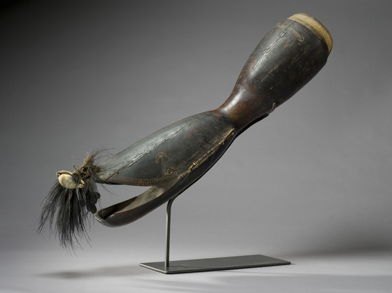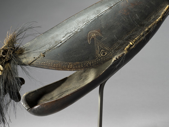 Wood, fiber, shell, and cassowary feathers