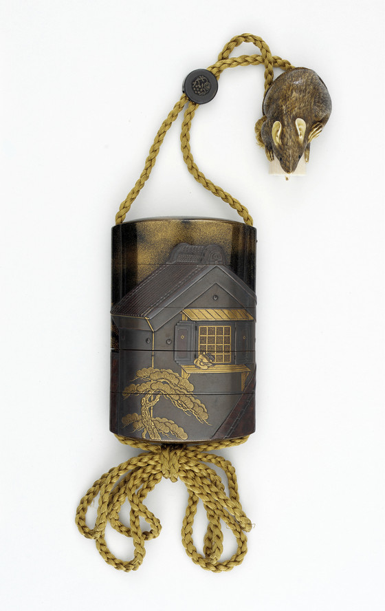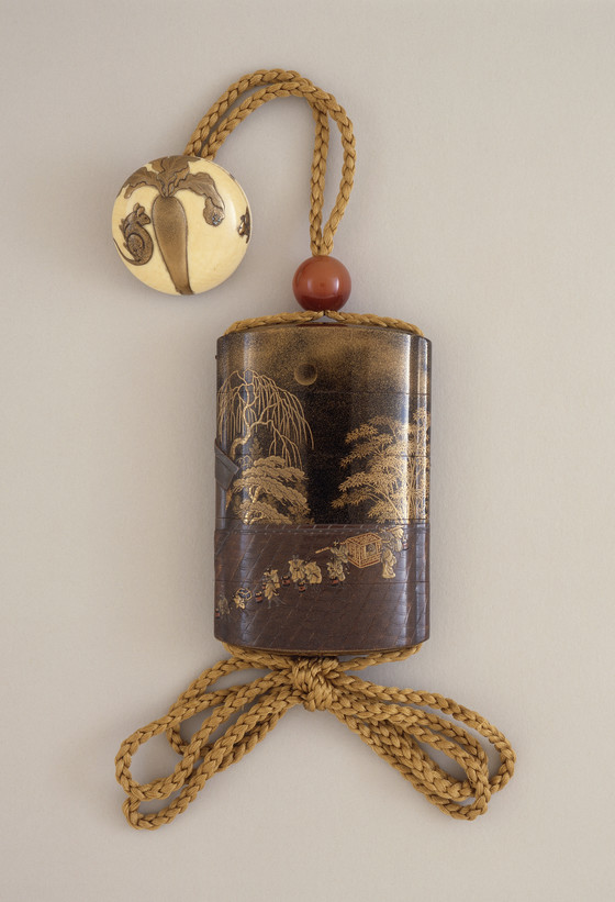 [inrō] takamakie on mura-nashiji ground on black lacquer ground; [ojime] glass?; [netsuke] ivory and lacquer