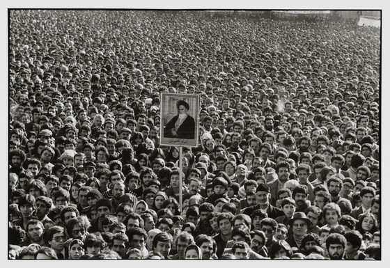 Ayatollah Ruhollah Khomeini's portrait is exhibited by the crowd attending the opening of the Tehran university.