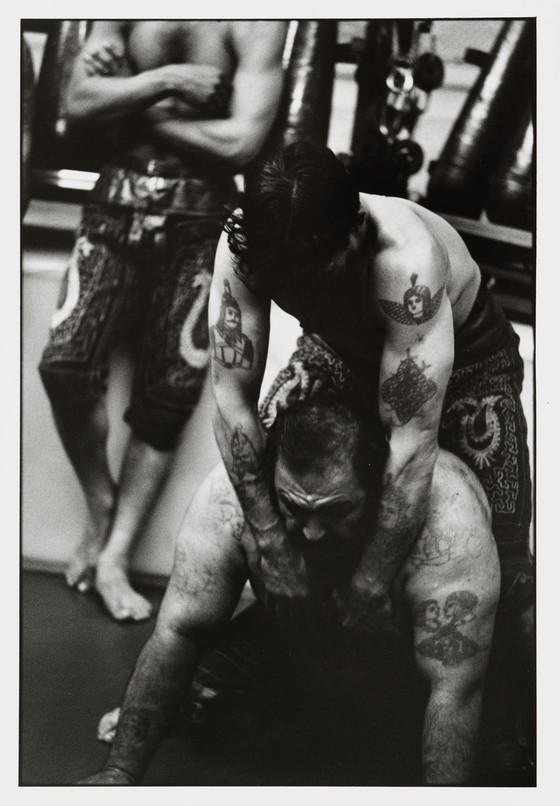 Wrestlers at training, wearing old traditional trousers. The Zourkhaneh (house of strength) was donated by the Shah to Shaabane-bi-mokh (Shaabane the Brainless) to thank him for sending his troops against nationalist leader Mossadegh, during the 1952 coup