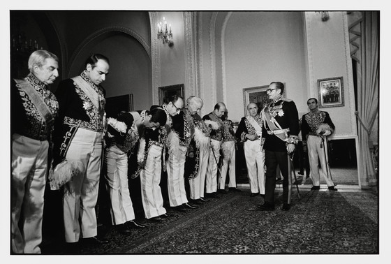 Courtesans bow to Shah Mohammad Reza Pahlavi during a Salaam ceremony celebrating the 58th anniversary of the Monarch in the Golestan Palace. On the right of the Shah is Amir Abbas Hoveyda, formerly Prime Minister and now Court Minister. On the left of ph
