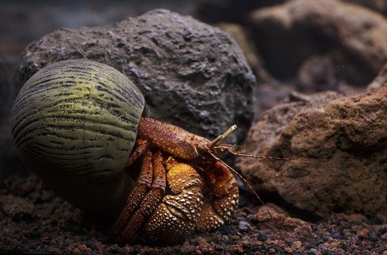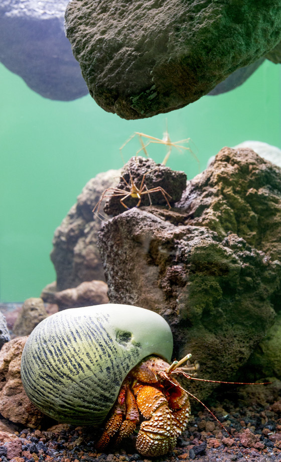 Glass tank, filtration system, resin mask, hermit crab, arrow crabs and basalt rock