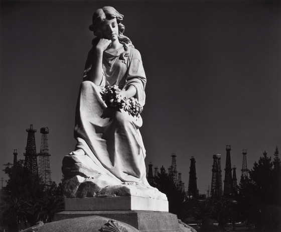Cemetery Statue & Oil Derricks, Long Beach, Calif.