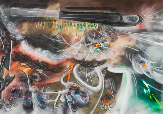 In Burn, Baby, Burn the viewer's eye moves incessantly from one point to another, echoing the bold dynamic and rhythmic sense of this quasi-galactic, futuristic composition. There is an electric, almost cinematic quality to the picture. Through a powerful turbo-like shorthand, Matta conveys a sense of speed and dislocation. Signs are scattered throughout the surface: imploding satellites to the left, suggesting the velocity with which news travels, a bolting vehicle at the top speeding across a freeway, and a group of black heads in a vertiginous vortex to the right. The phosphorescent, pungent green at the bottom right of the composition suggests hope, a verdant future. Like Picasso's Guernica (1937)-a work that Matta greatly admired and which he helped install in the Paris 1937 Universal Exposition-Burn, Baby, Burn is a bold indictment of the destructiveness of mankind and a manifesto for peace.