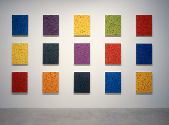 a-o) Panel: 27 x 20 x 2 in. each (68.58 x 50.8 x 5.08 cm); a-o) Overall: 111 x 189 x 2 in. (281.94 x 480.06 x 5.08 cm)