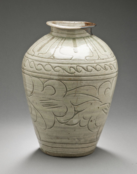 Buncheong ware; stoneware with incised slip decoration and pale green glaze