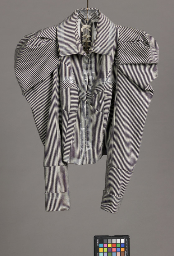 Cotton twill, cotton plain weave, fulled and quilted, cotton twill tape, polyeurathane trim, metal grommets, and plastic buttons