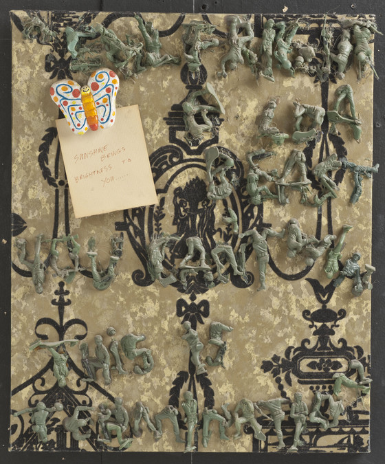 Plastic army men and flocked newspaper
