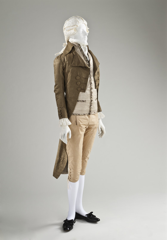 Silk plain weave with supplementary warp and weft float patterning, and silk- and metallic-thread passementerie, with metallic embroidered buttons