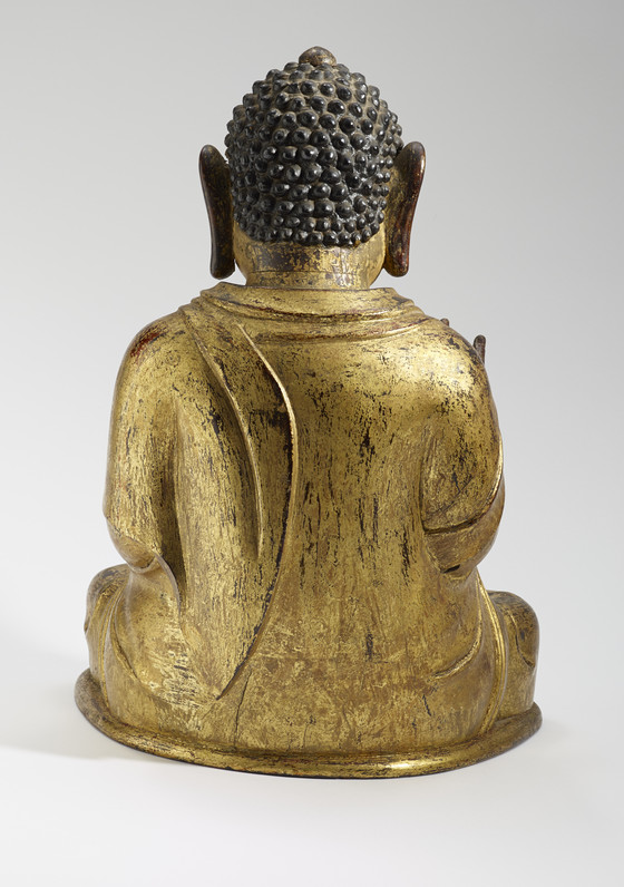Carved wood with lacquer and gilding, ink on paper, fabric, metal, paper, woodblock print