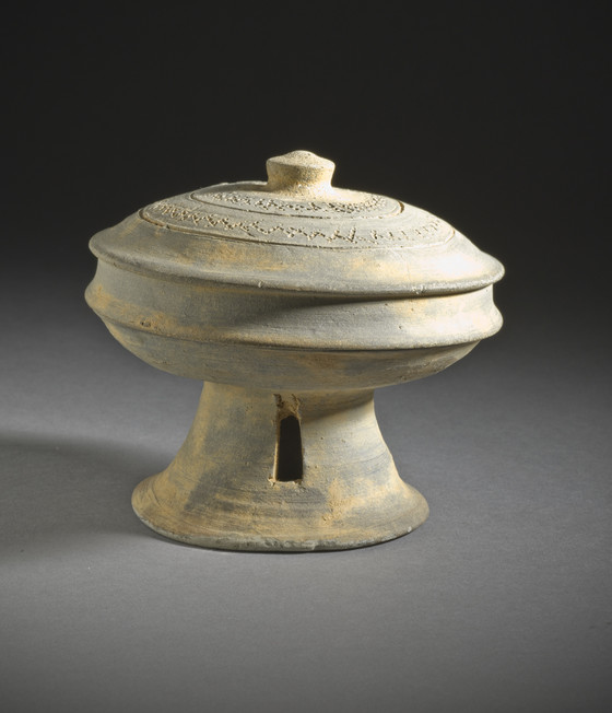 Coil-built and wheel-turned stoneware with impressed and cut decoration and ash glaze