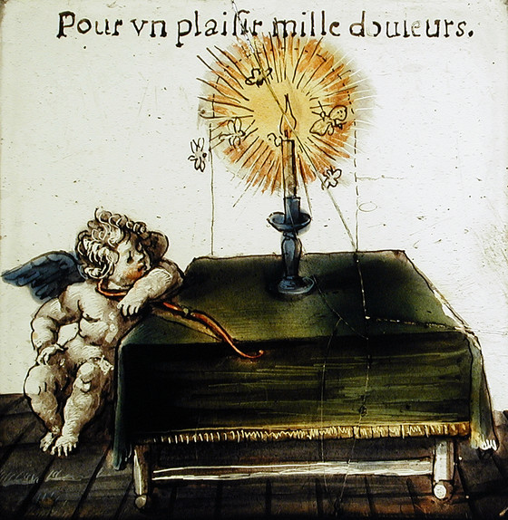 White glass with bubbles; silver stain; vitreous paint; translucent enamels
