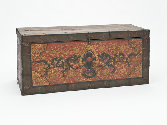 Wood with cloth, mineral pigments, and gilding; metal fittings