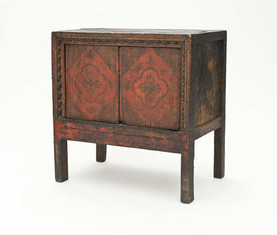 Cabinets, typically with doors on the front, were ubiquitous accoutrements in Tibetan monasteries and temples, as well as shrines and living rooms in many private homes. They were widely used to store myriad objects, including both religious and mundane items. See Luca Corona and Camilla Hulse Corona, "Tibetan Furniture: Construction, Form and Function, in David Kamansky, ed., Wooden Wonders: Tibetan Furniture in Secular and Religious Life (Pasadena: Pacific Asia Museum and Chicago: Serindia Publications, 2004), pp. 41-44.