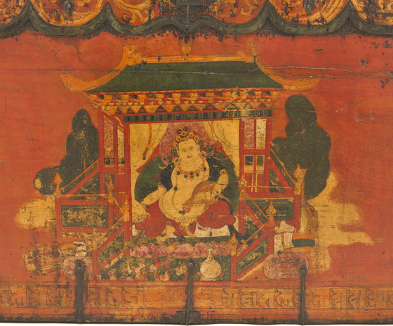 The crowned and bejeweled Jambhala is enthroned in a Tibetan pavilion. In his left hand, he holds a jewel-spewing mongoose named Nehulay. In his right hand, he carries a citron (jambhira). Displayed before him are precious gems and a lidded flask (surahi). In the bottom border is an inscription written in Lantsa script. Along the flush top of the trunk is a faux overhang embellished with golden scrolling medallions. It replicates the actual overhangs on Tibetan leather trunks (see M.2010.78.10 and M.2010.83.2). The trunk has the standard metal reinforcement fittings on the corners and edges of the trunk, and a hasp latch