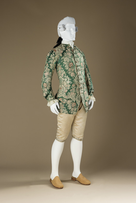 a) Robe center back length: 29 1/4 in. (74.3 cm); b) Waistcoat center back length: 55 3/4 in. (141.61 cm)