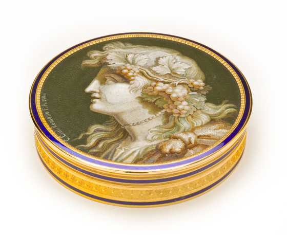 Traditionally hailed as one of the finest extant examples of micromosaic, this bonbonnière features the virtuoso work of mosaicist Clemente Ciuli, mounted in a gold box by renowned French goldsmith Adrien-Jean-Maximilien Vachette. Part of the Gilbert Collection of decorative arts, the bonbonnière is a gift to LACMA from Lady Marjorie Gilbert, wife of Sir Arthur Gilbert, in honor of Arthur's birthday, May 16th. This is one of two micromosaics from the Gilbert Collection believed to have been selected by sculptor Antonio Canova for presentation to Napoleon from Pope Pius VII during his attendance at Napoleon's coronation in 1804. While visiting London in 1971, Sir Arthur saw the bonbonnière at Garrards & Co., the Crown Jewelers. Thinking it was a miniature enamel portrait, Gilbert was astonished to discover that it was a micromosaic, composed of an estimated 1,500 tiny glass tesserae per square inch. Sir Arthur himself coined the name "micromosaic" and amassed one of the largest collections of these objects during his lifetime. The bonbonnière was one of Gilbert's most treasured acquisitions, kept in his possession until his death.