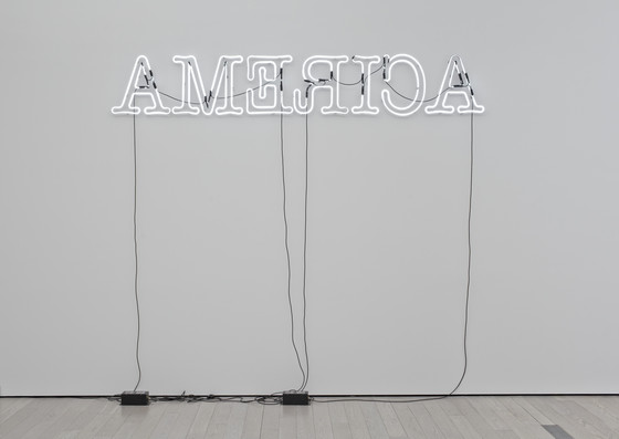 Ligon cites Charles Dickens' famous opening passage from A Tale of Two Cities ("It was the best of times, it was the worst of times..."), full of paradoxes and a somewhat apocalyptic appraisal of its setting, as the source for his America series. At once, this expansive neon courier-font A-M-ER- I-C-A in-verso conjures what Ligon describes as the "somewhat troubling" moment in our country's identity. Consistently incorporating and addressing the body- whether his own body, the black body, the homosexual body, the American body, the artist body, or various combinations therein - Ligon's works in painting, drawing, sculpture, photography, video, installation, and mixed media are among the most rigorous, iconic, timely, and beautiful images of the past few decades.