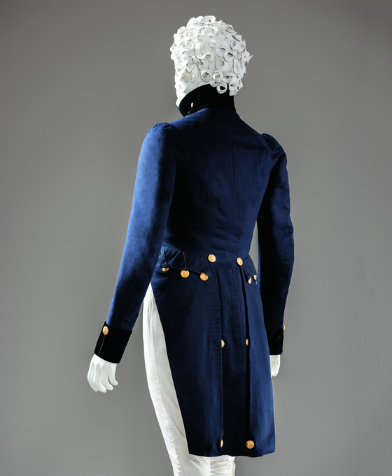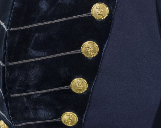 Wool plain weave, full finish, and silk velvet with wool braid trim and metallic buttons
