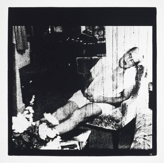 Descriptive: man sitting on chair appears unconscious (dead?), hands on his lap holding something