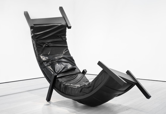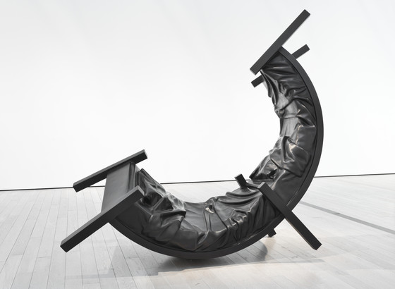 In 2000, LACMA presented an exhibition of Therrien’s work, organized by Lynn Zelevanksy, which included a group of fifteen black and white single beds that were attached and twisted in corkscrew forms. The white beds no longer survive and only a few of the black beds remain. Mesmerizing and disorienting, these aggrandized everyday objects, including the tortuous black bed in No Title (black beds) (1998), transport the viewer into an Alice in Wonderland-esque fantasy land. The beds were the culmination of a long search for a subject that would lend itself to the creation of a potentially unending sculpture. In the bed form, Therrien found a visual palindrome, a structure whose head and foot were identical, so that multiples of it could, theoretically, be attached to each other ad infinitum. No Title (black beds) embodies all of the features that give Therrien’s art such a powerful grip on the imagination: its capacity to elicit both sensuous pleasure and vague disquiet, the tension it maintains between an inviting familiarity and a stony distance, its ability to produce chuckles as well as gasps of awe. (Lauren Bergman, Assistant Curator Modern Art)